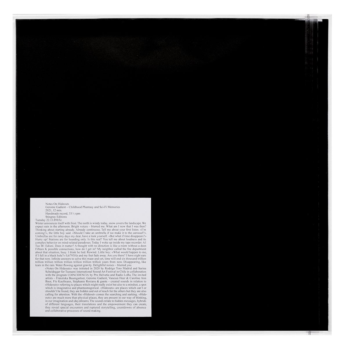 This project was initiated by Rodrigo Toro Madrid and Sarina Scheidegger for Tsonami International Sound Art Festival in Chile, in collaboration with the program COINCIDENCIA by Pro Helvetia and Radio Lora. The invited artists - Franziska Baumgartner, Gerome Gadient, Vanessa Heer & Caroline Ann Baur, Flo Kaufmann, Stéphanie Rosianu - created sounds in relation to «Hideouts» referring to places which might really exist but also to a mindset, a spot which is imaginative and phantasmagorical. Hideouts» are places which can’t or shouldn’t be found, they are hidden and out of reach for the others but they are also calling for attention. With the «Hideout» comes the searching and seeking. «Hideouts» are much more than physical places, they are present in our way of thinking, in our imagination and (day)dreams. The sounds relate to hidden messages, hybrids of different languages, their translations and the empowerment they can create, they reveal spacial encounters and ruptured storytelling, countdowns of absence and collaborative processes of sound making.