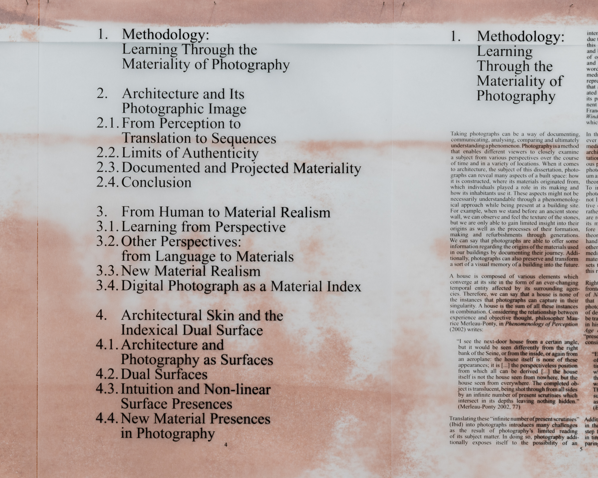 Alongside the written dissertation, a practice-based body of photographic simulations have shaped four installations exhibited during the course of the research. These installations investigate the Degerfelden sandstone used in the Basler Münster as their main case study. Throughout this research it becomes evident that photographs can be considered as entities with two Image and Material surfaces. The Intra-act (Barad 2007, 141) of these two surfaces can shape narratives, which add to our phenomenological encounters and in some cases go beyond our direct experience with architecture by providing information which we could have not known otherwise. This type of material photography can additionally result in breaking the linearity of time, pointing out a coexistence of pasts and presents embedded on the photographic surfaces simultaneously.